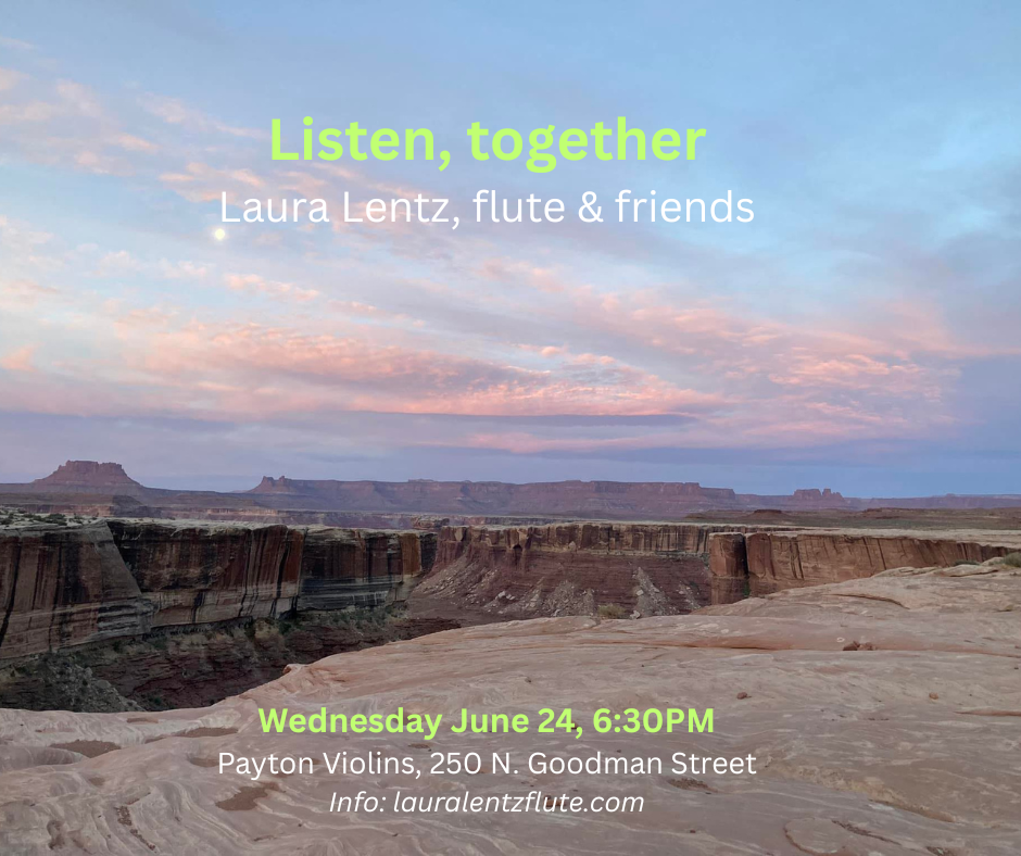 Join for a concert of varied music for flute in a special concert called Listen, together on Wednesday June 24, 6:30PM at Payton Violins as Laura starts a new chapter in Salt Lake City, Utah, at the end of the summer.